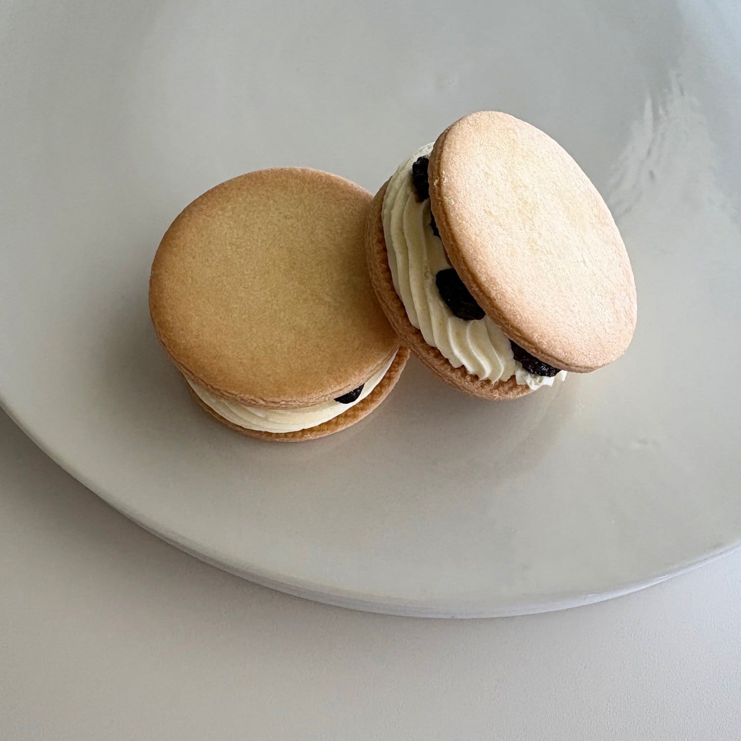 健やかな大地で大切に育てられた牛から分けてもらうミルクを、伝統的な手法を支えるバター職人によってつくられた有機醗酵バター。つややかなイタリアンメレンゲやヴァローナのホワイトチョコレートとあわせて、なめらかなバタークリームに仕上げました。ラムの香りをたっぷり含ませたジューシーなラムレーズンと一緒にサクサクサブレにサンド。